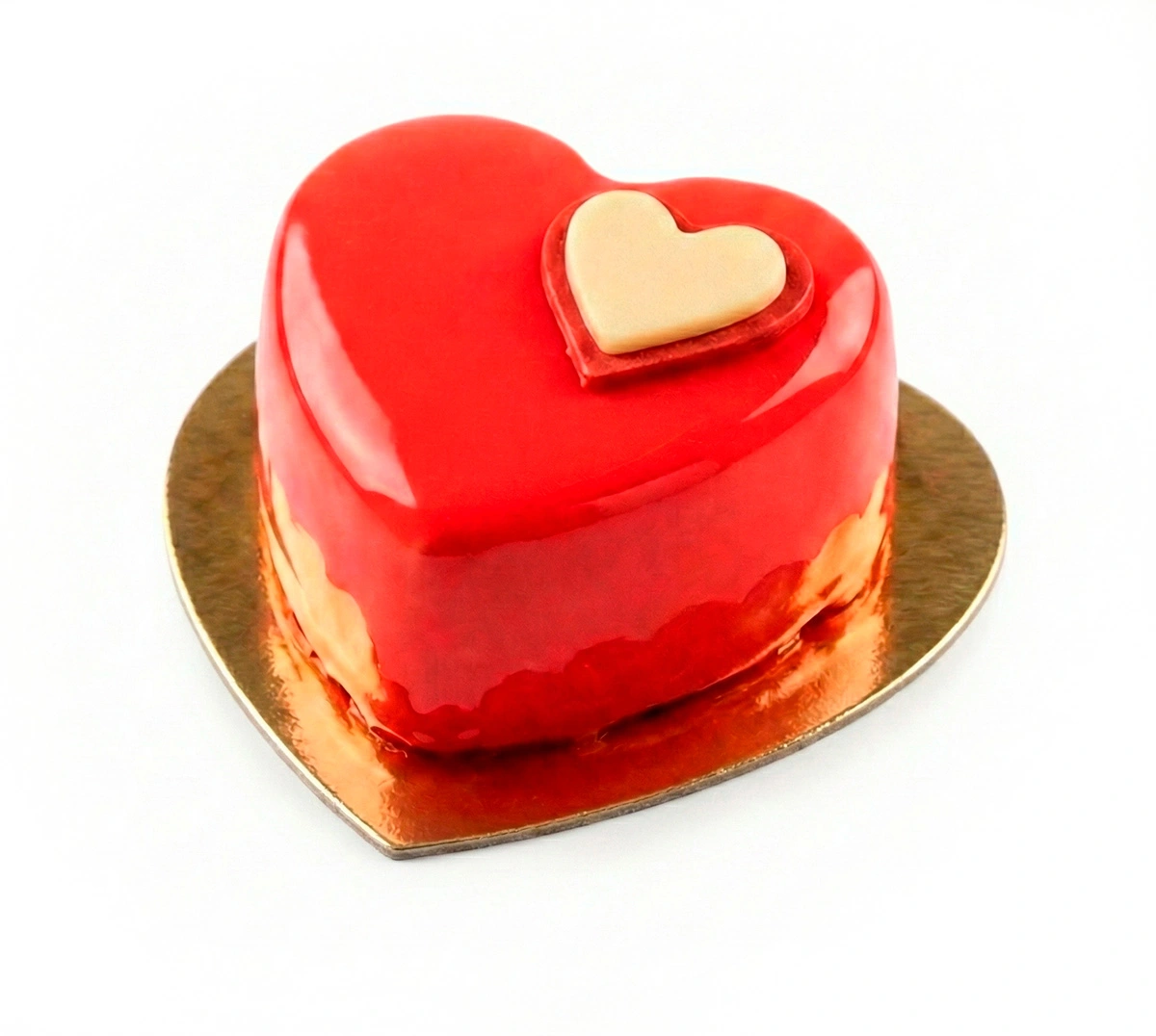 Corazones rojos elaborados con mousse de fresa o fruta de la pasión, que envuelven un cremoso interior de mousse de chocolate con leche.